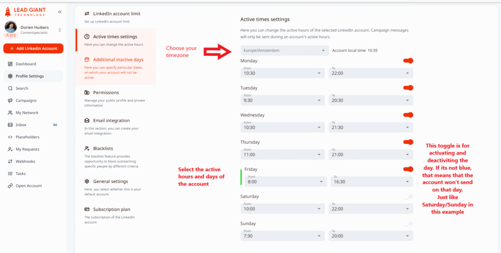 2. Select the timezone of the account and set the hours and active days. Only during the set times and days account will be sending connection requests, messages and the rest of the actions. We always recommend making hours different every single day, to mimic human behavior and keep your account safe, as well as setting some days to inactive, by pressing on the toggle, like indicated in the screenshot below