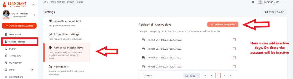 - Go to the Profile Settings of the account and click on Additional inactive days