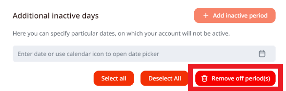 From here you can also delete/remove an inactive period (s) you may have already set. To do this, select the created inactive period and press on Remove off period (s) button