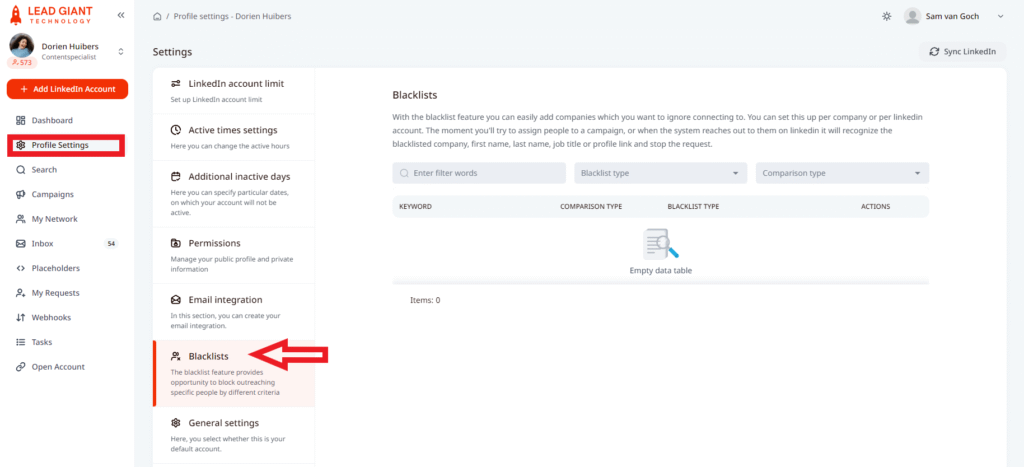 In order to reach the blacklist option, you need to go to Profile Settings from the dashboard and click on the Blacklist option