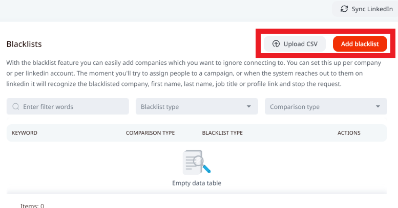 This feature allows you to upload a list of users that you do not want to contact. This means, that even if they fall within a search you upload into LeadGiant or are added to the campaign, the system will not send automated tasks to the profiles and those leads will be paused. In order for them not to be blacklisted anymore, you would need to resume them in the campaign.