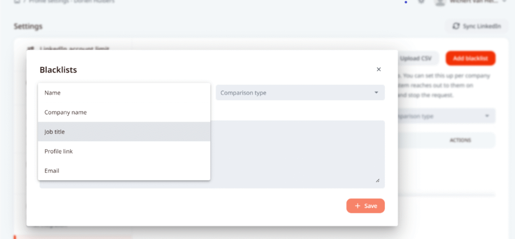 2. Choose the Blacklist type and Comparison type from the dropdown menu
