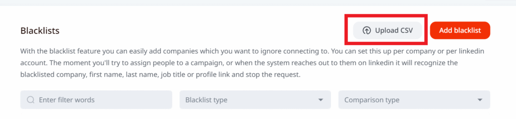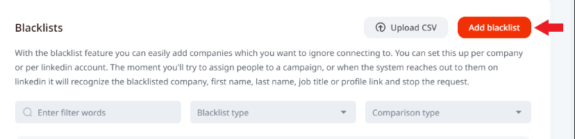In the Blacklist section, you will see two options to add a blacklist to the account, you can either manually upload a blacklist by pressing on Add blacklist button or upload it via CSV file by clicking on Upload CSV