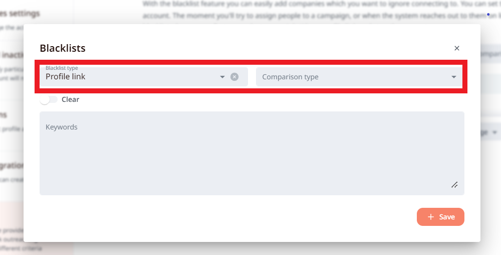 3. (SKIP THIS STEP IF YOU ARE ADDING A NEW BLACKLIST) You will also notice a Clear toggle, this can be used if you wish to clear (delete) the already added blacklist. If that is what you wish to do – turn the Clear option on if you would like to clear the previously added blacklist that fits the selected blacklist type (profile link) and comparison type (exact). In this case, the Keywords section would have to be left empty. Now if you save the changes all the previously uploaded exact-match profile links will be deleted from the blacklist section and won’t be blacklisted anymore