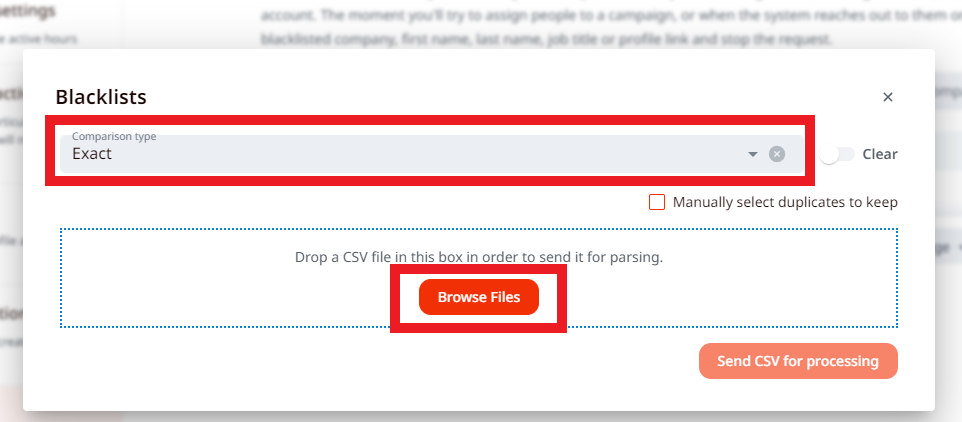 3. (SKIP THIS STEP IF YOU ARE ADDING A NEW BLACKLIST) Clear toggle can be used if you wish to clear (delete) the already added blacklist. To do this, you would need to select the comparison type, turn on the clear toggle, add a CSV file with the blacklist you wish to be removed, and press Send CSV for processing