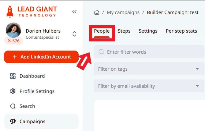 1. Go to the Campaigns section on LeadGiant, click on one of your campaigns, and make sure you are in the People’s tab