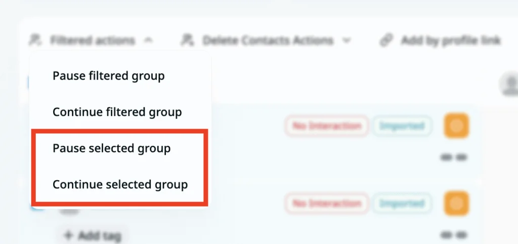 2. Simply select the leads you wish to pause or resume, press Filtered actions, and select Pause Selected Group if you wish to pause the leads or Continue Selected Group if you wish to resume the leads in the campaign