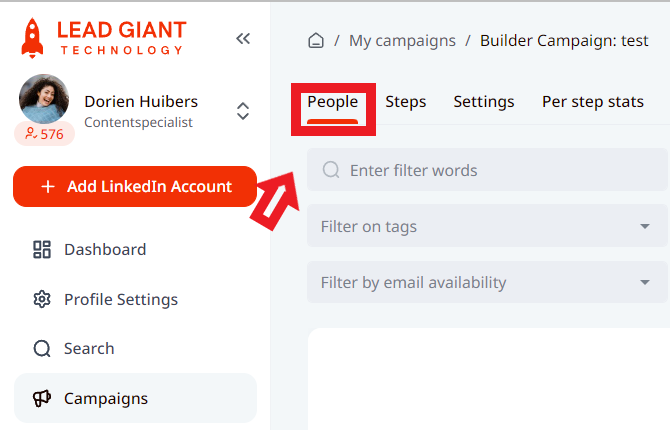 - Go to the Campaigns section on LeadGiant, click on one of your campaigns, and make sure you are in the People’s tab