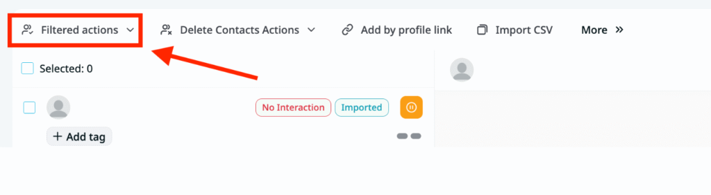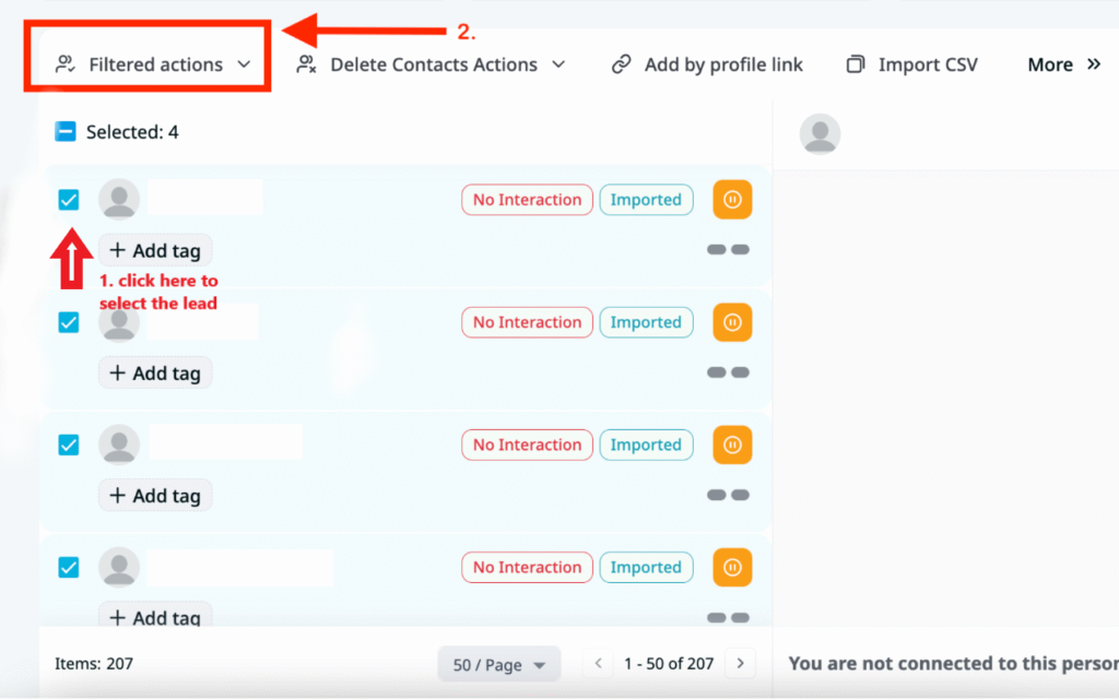 2. Simply select the leads you wish to pause or resume, press Filtered actions, and select Pause Selected Group if you wish to pause the leads or Continue Selected Group if you wish to resume the leads in the campaign