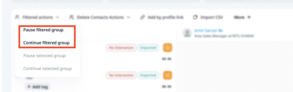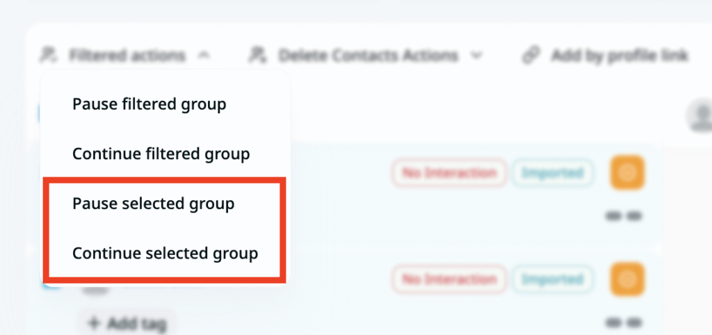In the campaign, use the filters to find the leads you wish to pause or resume in bulk, then without selecting any of them, click on Filtered actions and Pause Filtered Group or Continue Filtered Group options