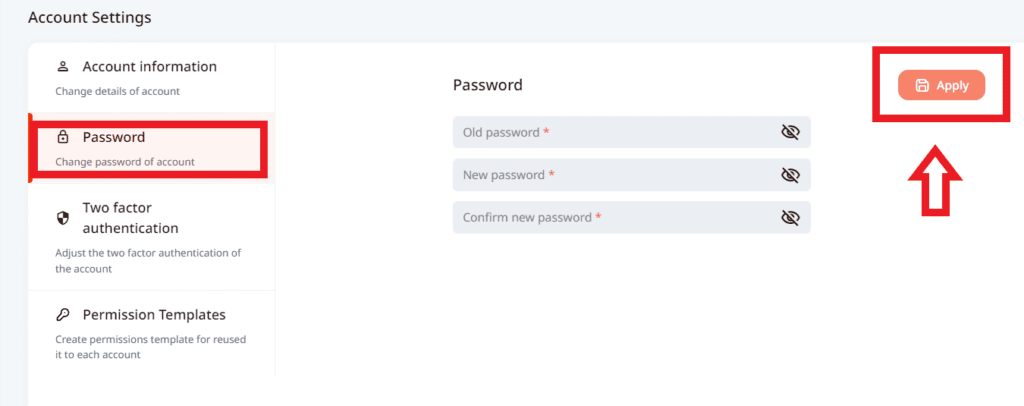2. Click on Password, then enter your old password and the new password, confirm it, and click Apply to save changes