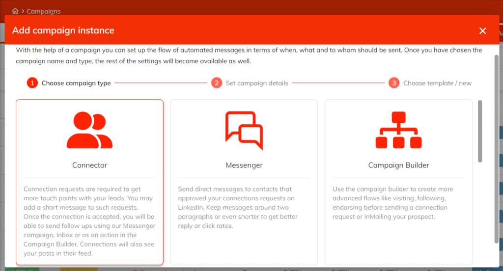 • Go to the Campaigns tab, click on Add Campaign, and select Connector Campaign Type.