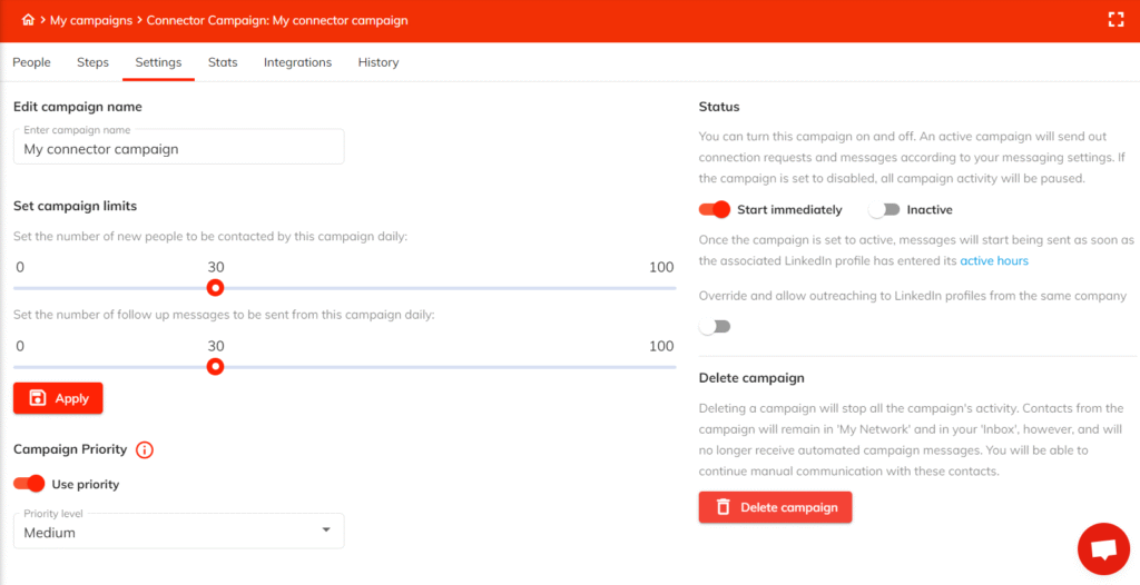 3. Additionally, here you can set campaign limits, by choosing how many messages and connection requests to send out per day. This isavailable for every campaign which is active and will contribute to the total.Keep in mind that from your account, a maximum of 100 connections can be sent per week. Even if you have 4 campaigns set at 100 people per day, Lead Giant is going to send connections to 100 people in total from your account per week, so please divide the total accordingly.