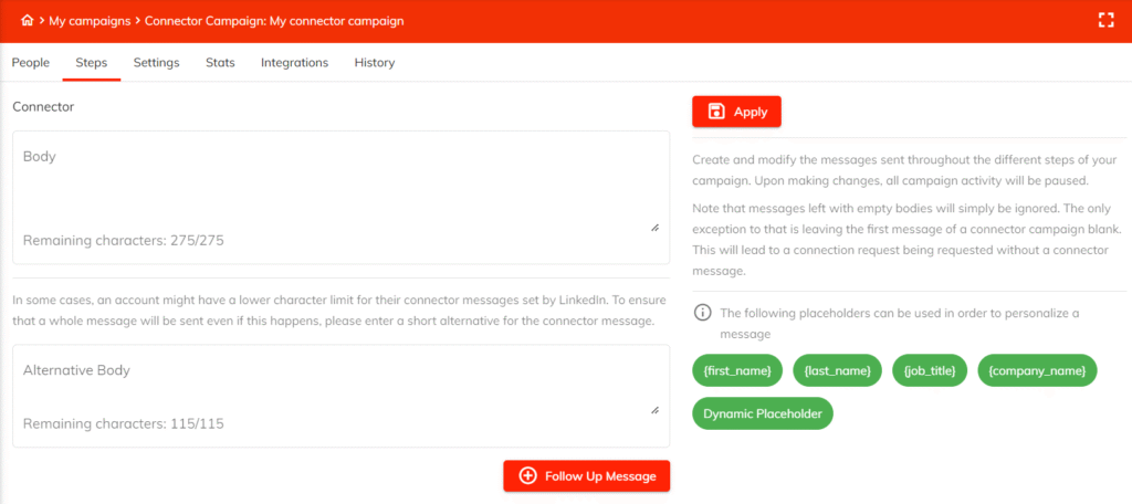 In this section, you can also create follow-up messages to send. The follow-up messages are messages which are sent after there is an established connection but still no response to the first message you sent.
