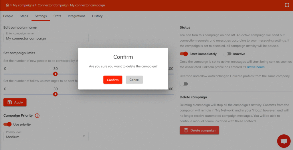 You can also delete your campaign in this menu by clicking on Delete campaign in the right bottom corner. If you’re sure you want to delete the campaign, click on Confirm when this window pops up.