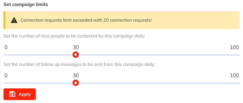 If you get a warning message about exceeding your daily limits please look at all active campaigns and adjust the numbers accordingly. When sending a connection request with a message, the connection request message is counted towards the daily messages sent from Lead Giant.