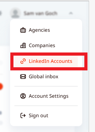 - Click on the user menu and select the LinkedIn accounts option