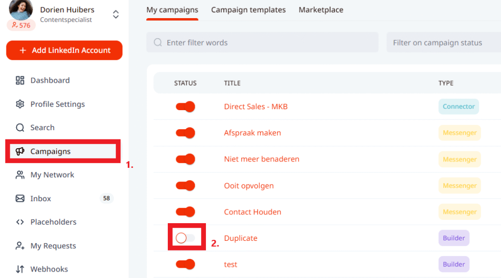 If you already created a campaign on LeadGiant but the toggle next to the name of the campaign is off, it means that the campaign is inactive. If the toggle is on and in blue, it means that the campaign is active.