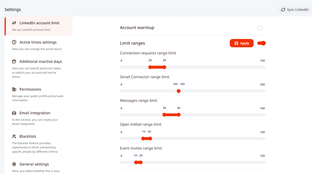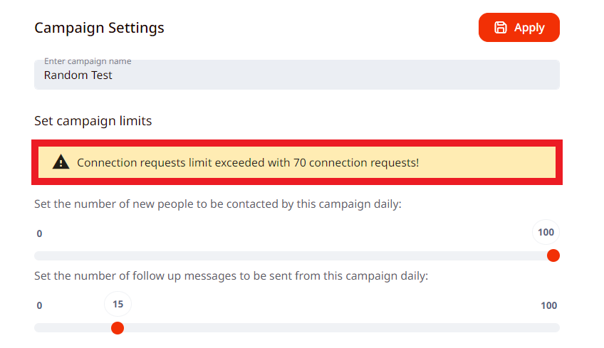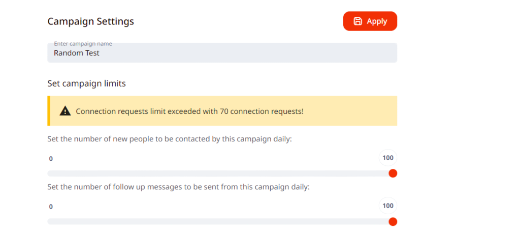 It is important to note, that even if you are exceeding the limits in campaign settings, the system will still follow the limits you set in the general profile settings, for connection requests, messages and etc.