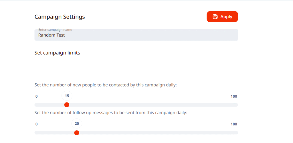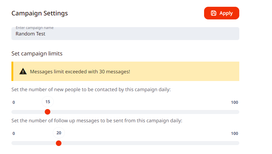 For example, 15 connection requests and 20 follow-up messages could be set in one campaign settings, limit section, and the same thing could be done in the other campaign.
