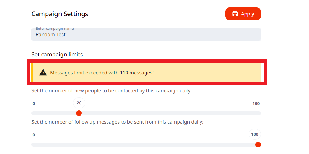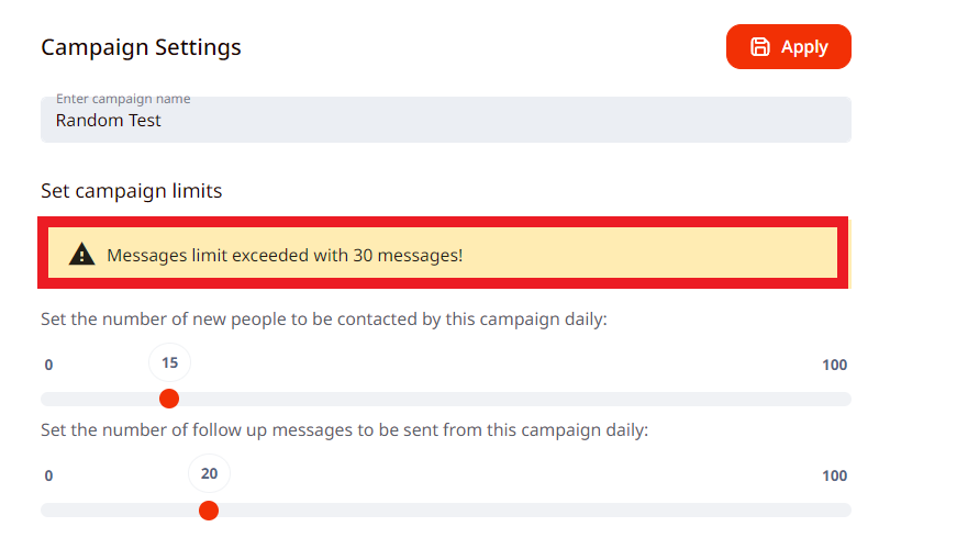If the limits in campaign settings are not divided correctly and the sum of them is higher than the numbers you set in the profile settings, an error message shows up in the campaign settings, which says: Messages limit exceeded with X messages or Connection requests limit exceeded with X connection requests.