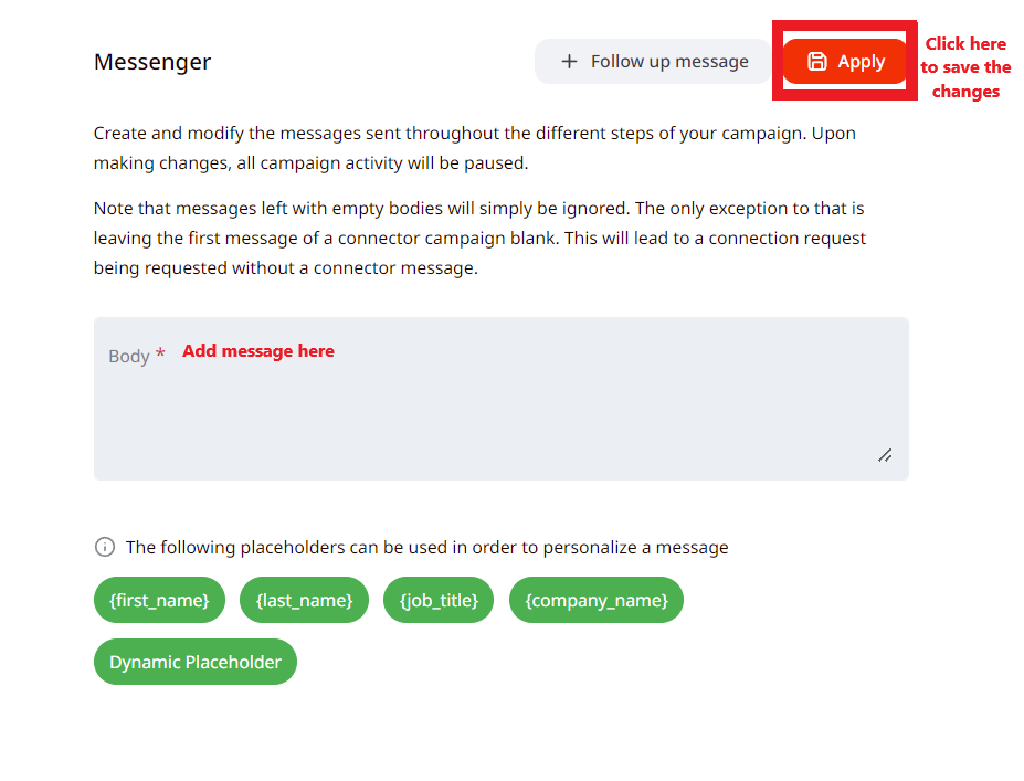 5. Add your first welcome message, click on + Follow-up message if you wish to add more messages to this campaign, select the time delay between messages and click Apply to save the changes