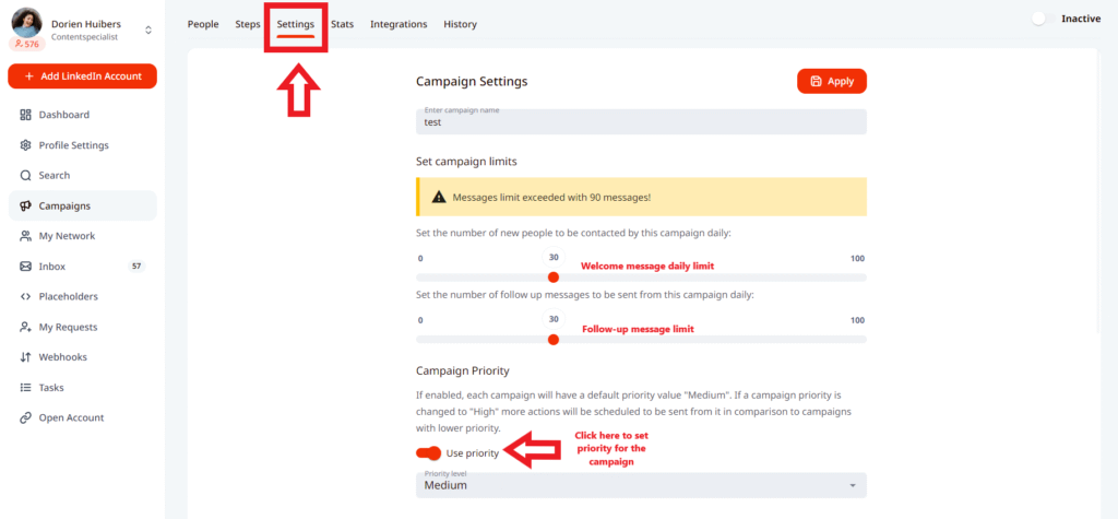 1. To set the limits and priority for the campaign, you need to go to the Settings tab of the campaign. There you will be able to adjust the limits and activate campaign priority, just like in the screenshot below. Keep in mind that the limits set in the profile settings have to be divided between all active campaigns in campaign settings, if you see an error message of exceeding the limits it means they are not divided correctly.