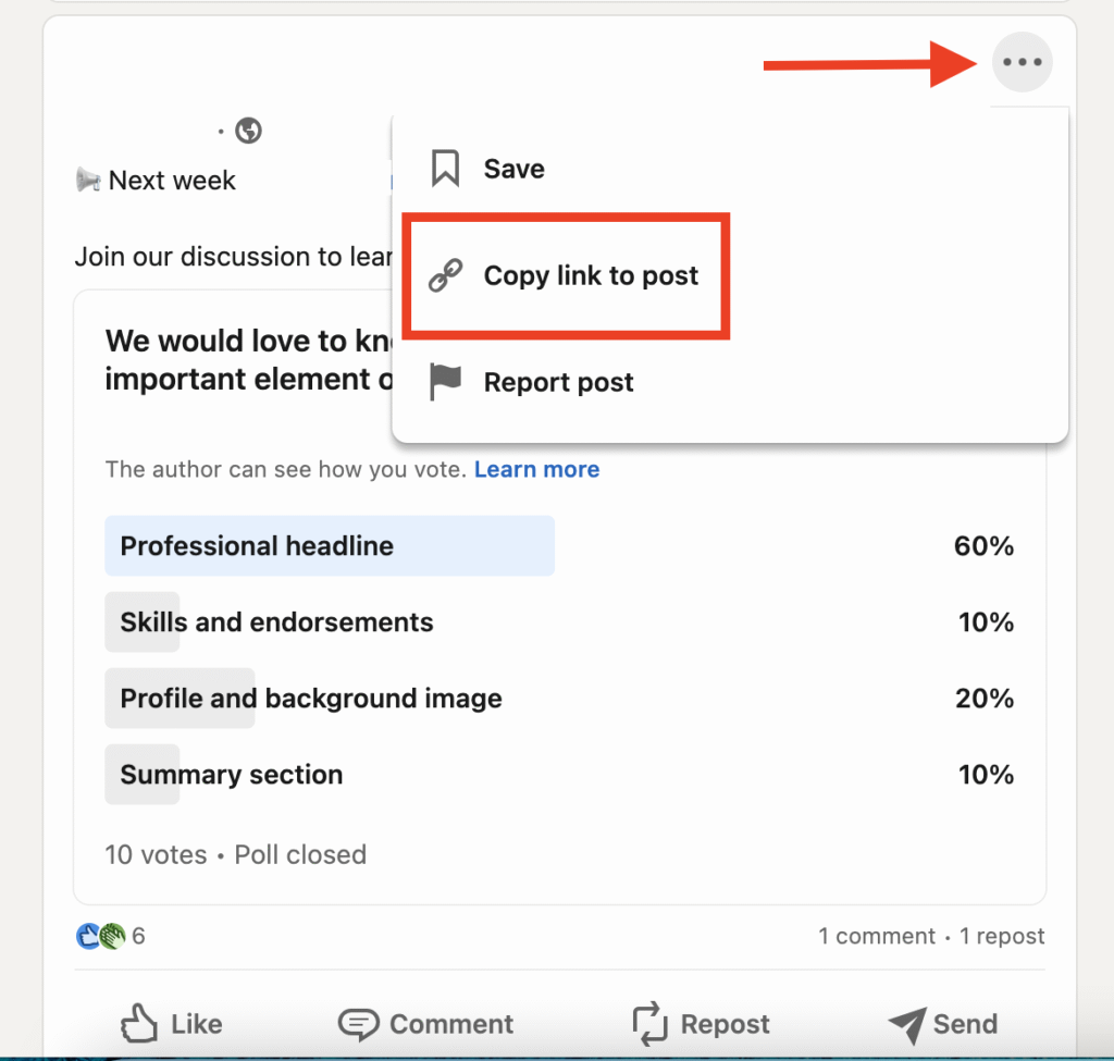 - Go to LinkedIn and find your poll. Click on the three dots in the upper right corner of the post. Then click on Copy link to post
