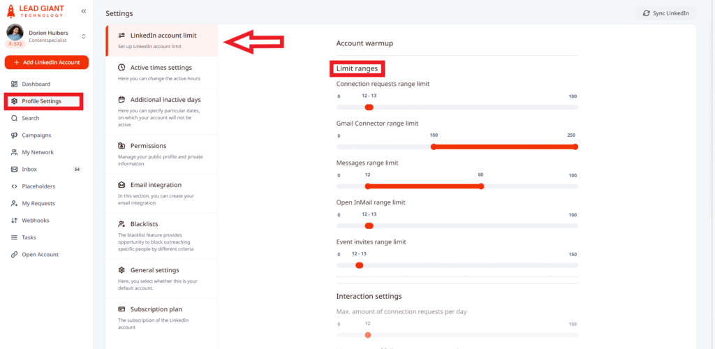 In the limit ranges you need to set the daily numbers for actions to be sent per day from LeadGiant and once it is done, click the button Apply to save the changes. Please keep in mind, to divide those numbers in the campaign settings as well, so the limits would not be exceeded, you can learn more about it and how it works here.
