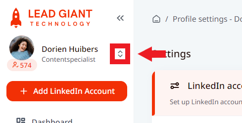 If you are managing multiple LinkedIn accounts on LeadGiant, you can switch between them in two ways on the dashboard, above the sidebar menu, or in the LinkedIn accounts section under the user menu.