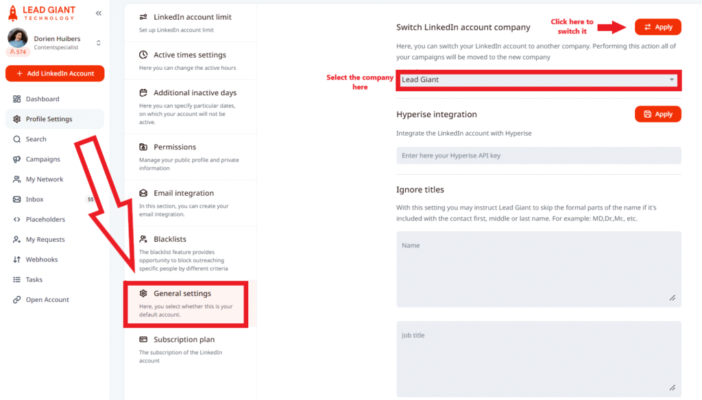 Once you have more than one company created, to change it for a LinkedIn account on LeadGiant, you should open that LinkedIn account and go to the Profile settings of it.