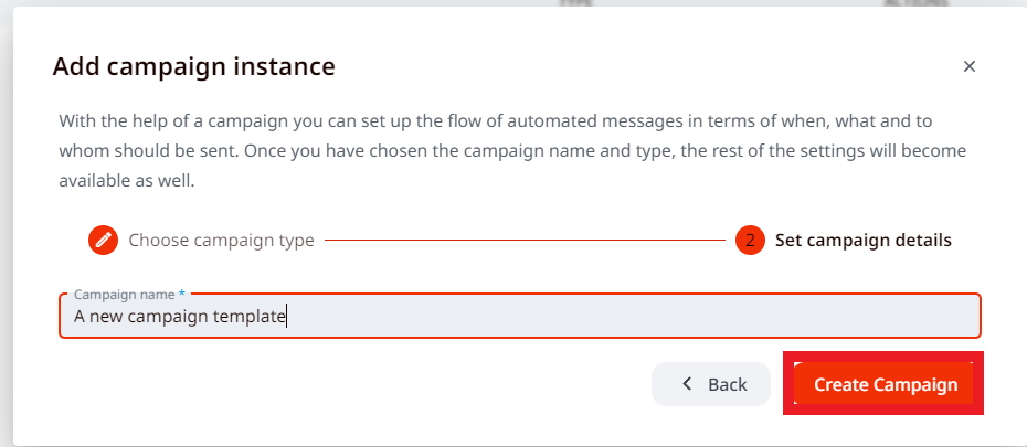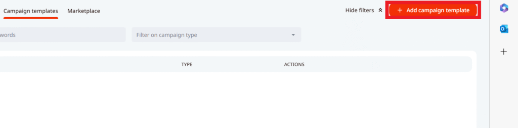 2. To create a template press on Add Campaign Template, select the type of campaign you wish to create a template for, write down the name, and click on Create Campaign
