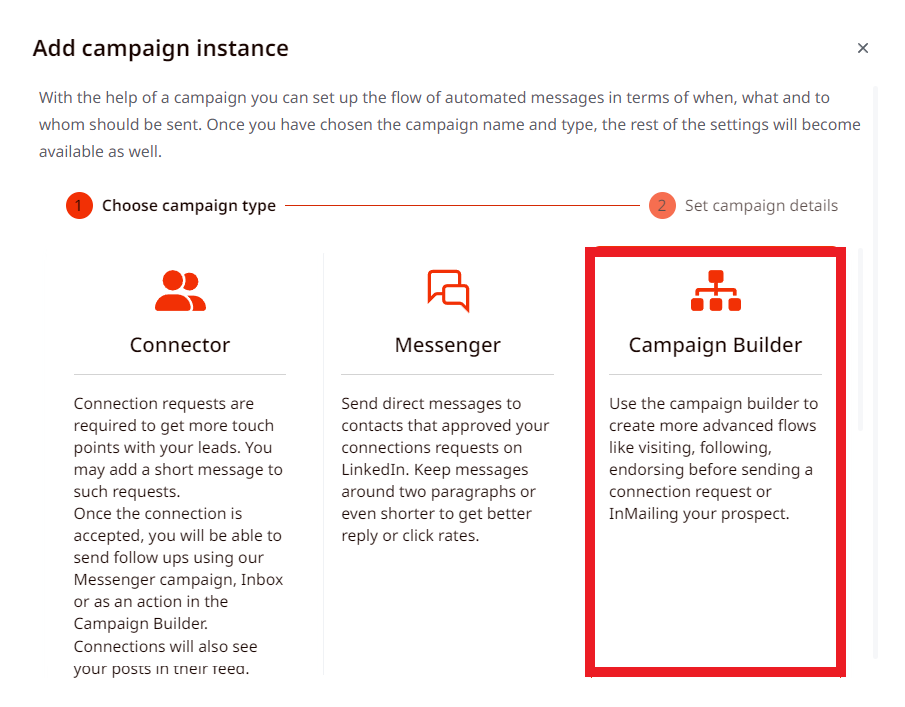 You can create templates for the following types of campaigns: connector, messenger, campaign builder, open InMail campaign, and Gmail connector campaign.