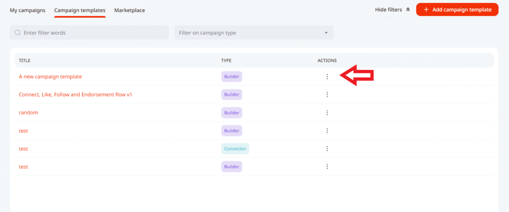 In order to use the template for a campaign and make it visible in the My Campaigns tab you would need to press on the 3 dots on the right side from the name of the template and click Create campaign instance from template