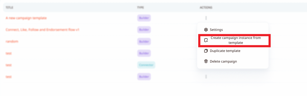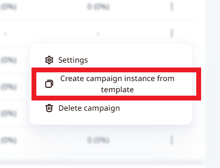 - Go to the Campaigns section on the sidebar menu on LeadGiant, Select the campaign you wish to duplicate, scroll to the right and press on the 3 dots, then click Create campaign instance from template
