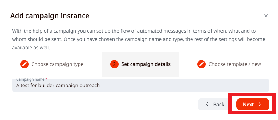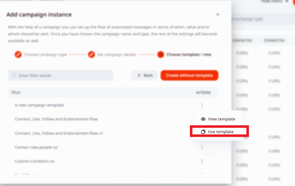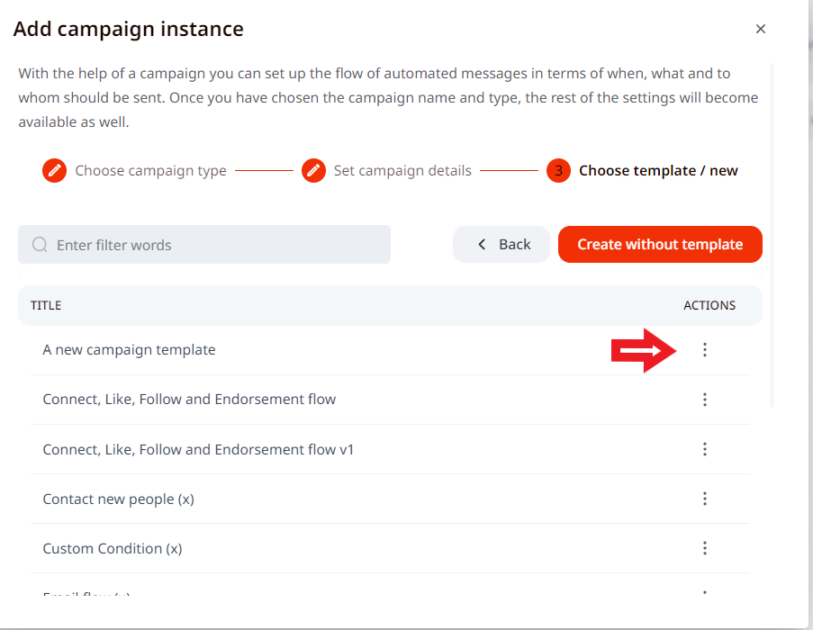 2. Select the type of campaign you wish to create, write a name for it, press next, and you will be able to view and select a template you created. To select a template, click on the 3 dots and choose an option Use Template