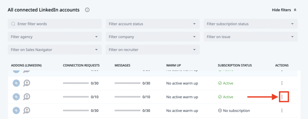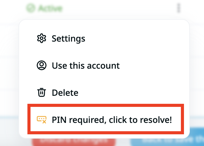 - When you add your LinkedIn account to the system, go to the user menu, LinkedIn accounts section, scroll to the right, click on the three dots icon and on Pin required, click on resolve! option