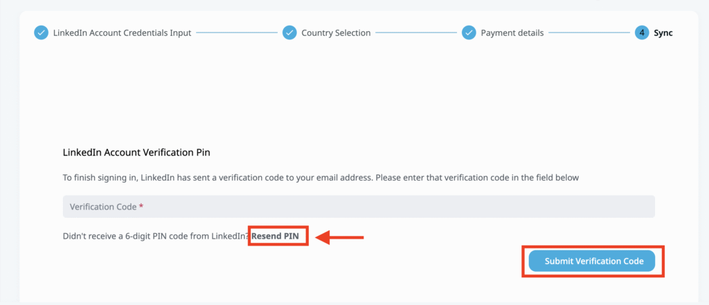 2. Click on the Resend button to receive a new pin from LinkedIn, enter it into the Verification code field in the next 10 minutes after receiving it, and click on Submit Verification code button
